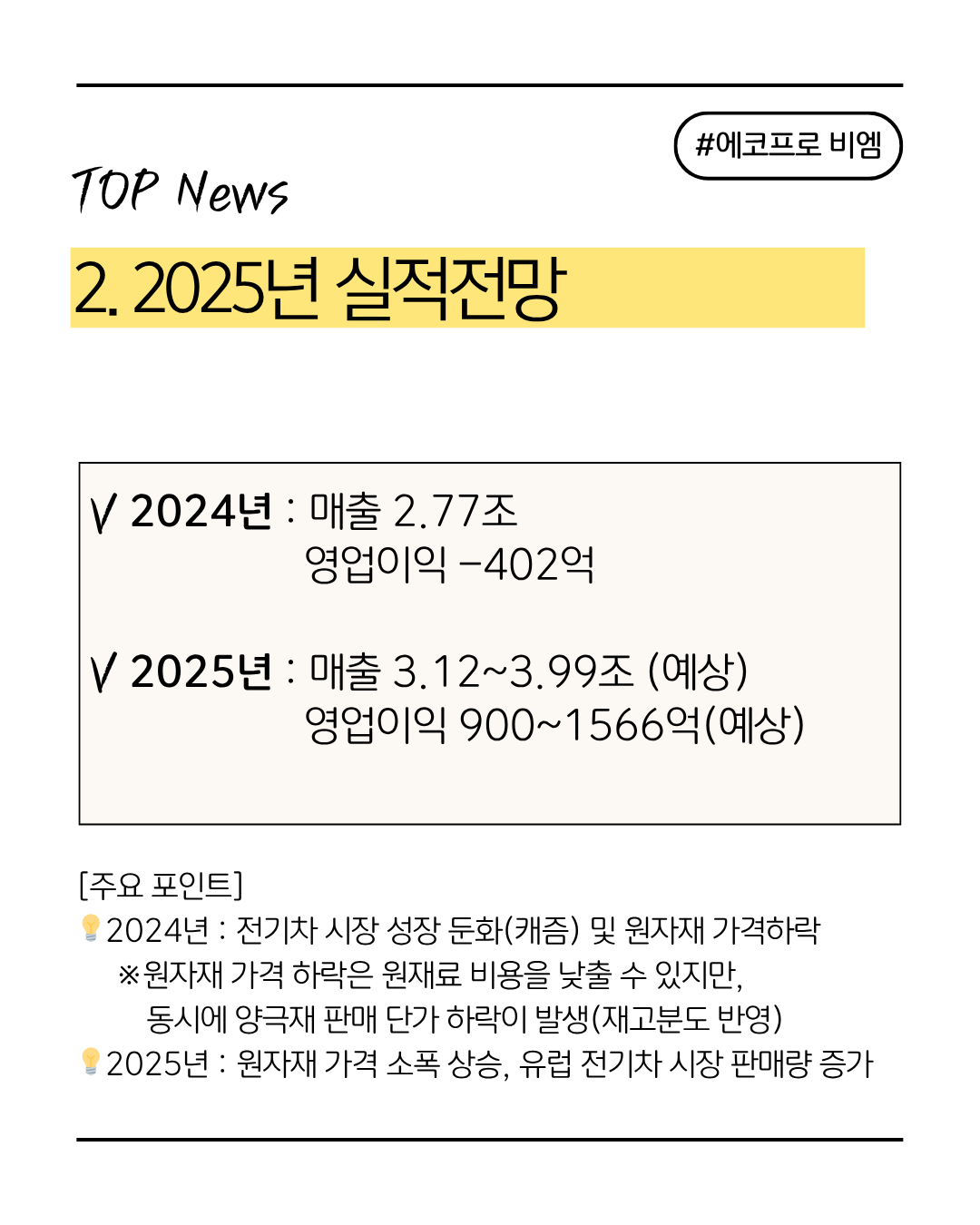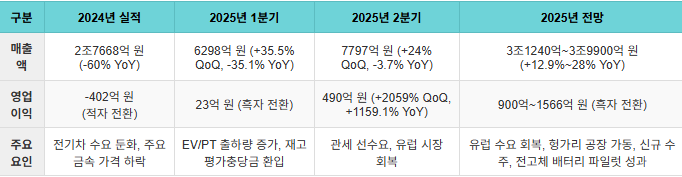 ● 2025년 전망: 유럽 EV 시장 회복(2분기 판매량 +33% YoY), 헝가리 공장 가동, LFP 샘플 공급, 전고체 배터리 파일럿 라인 성과로 매출 및 수익성 개선.