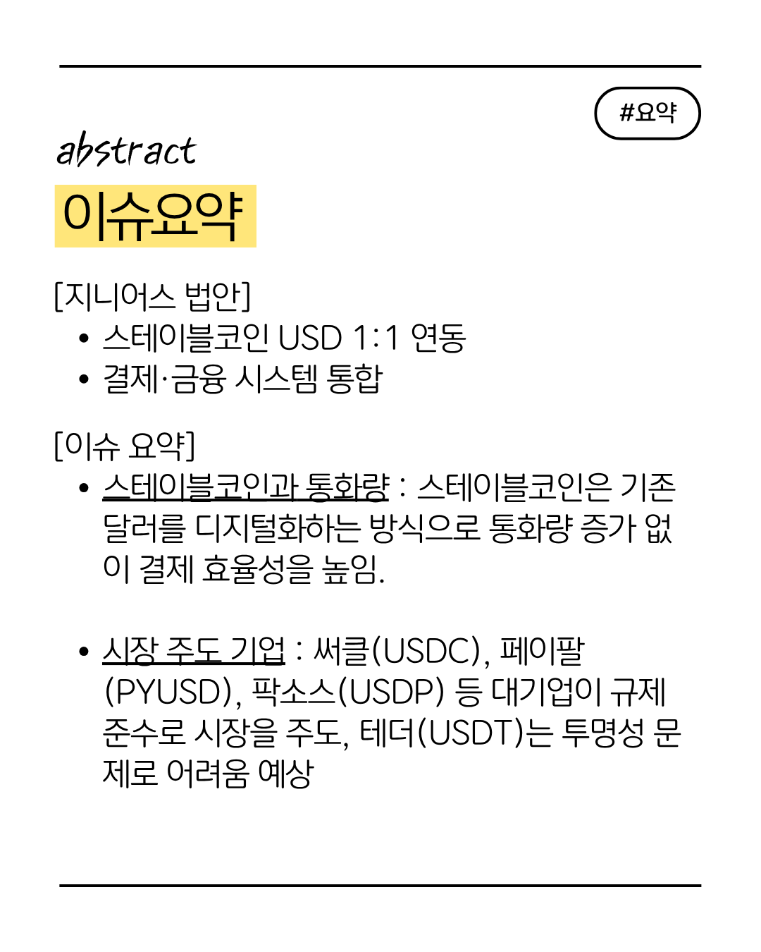 목적:스테이블코인을 합법적 결제 수단으로 인정하고, 글로벌 금융 시스템에서 안전하게 사용 가능하게 함.