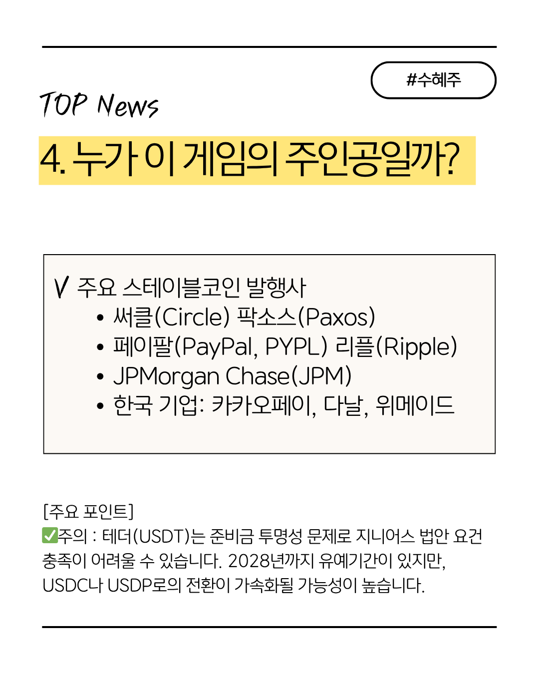 한국 기업: 카카오페이, 다날, 위메이드 등이 원화 스테이블코인 인프라로 수혜 가능.