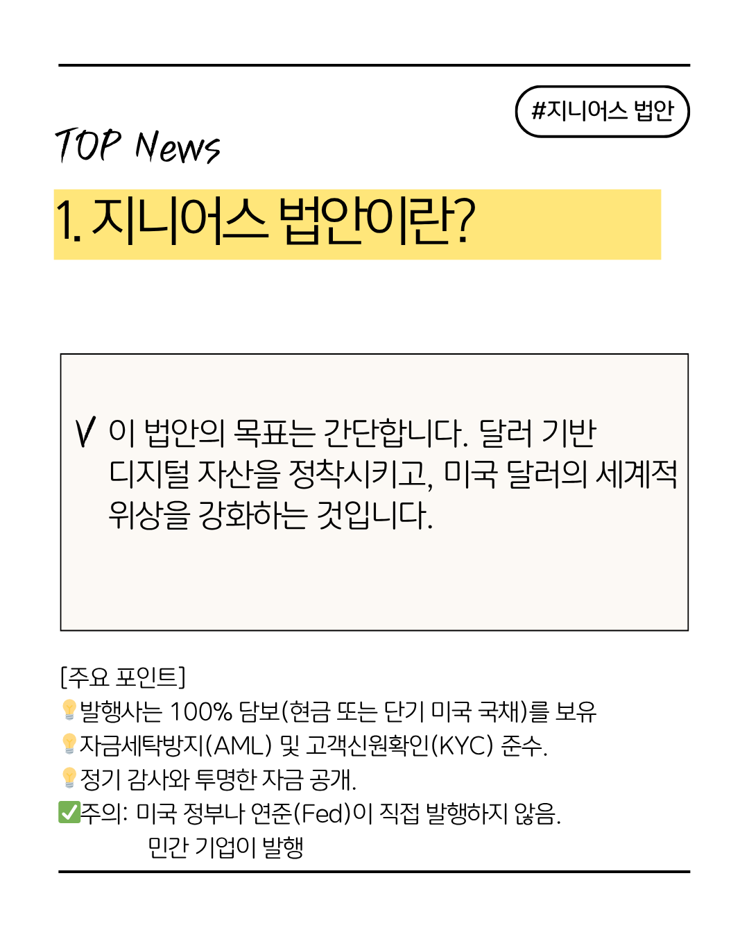 지니어스 법안은 스테이블코인을 미국 달러(USD)에 1:1로 연동, 이를 결제와 금융 시스템에 통합하려는 법안입니다.이 법안의 목표는 간단합니다. 달러 기반 디지털 자산을 정착시키고, 미국 달러의 세계적 위상을 강화하는 것.하지만 그 이면에는 복잡한 규제와 기회가 얽혀 있습니다.