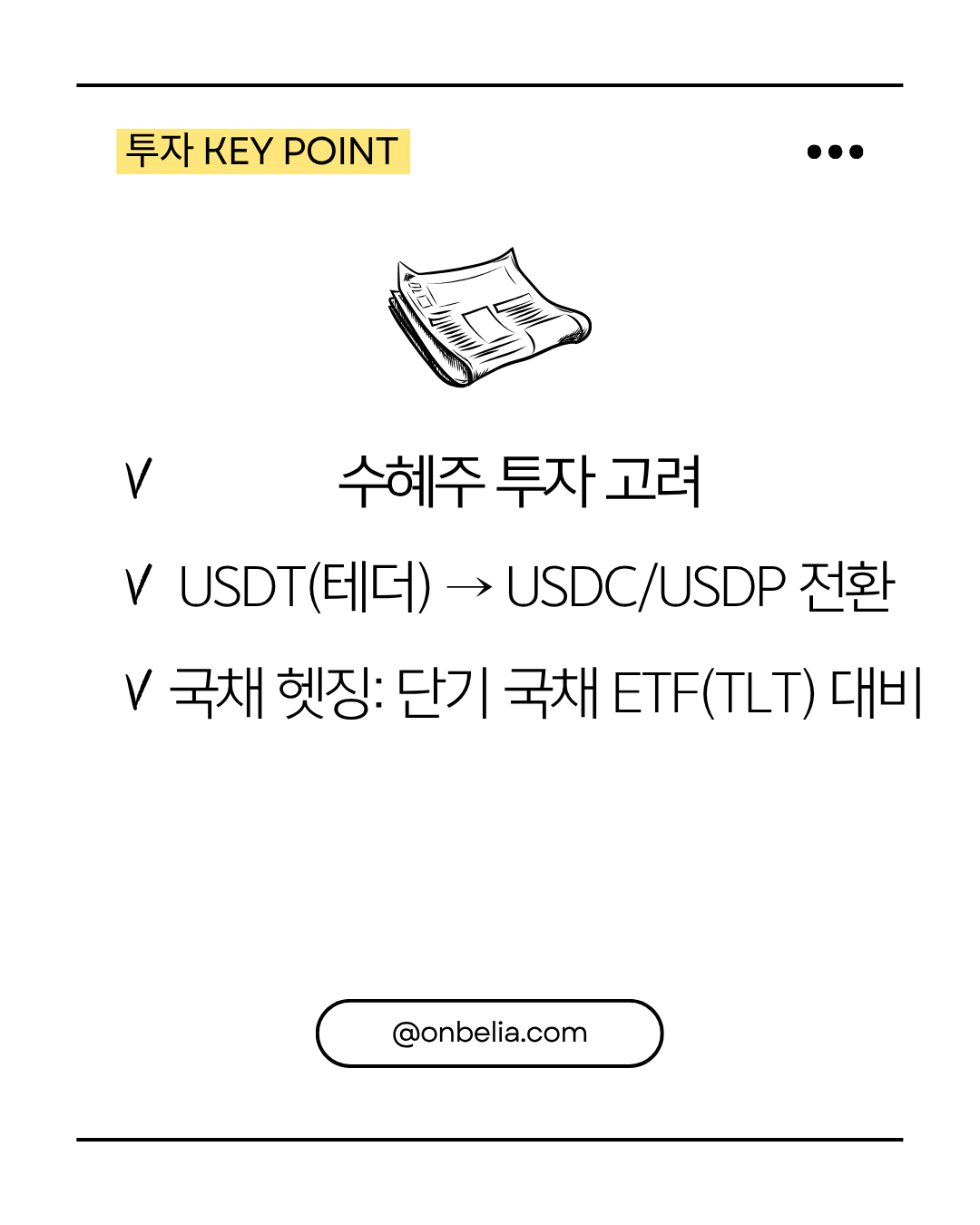 국채 헷징: 단기 국채 ETF(TLT)로 스테이블코인 담보 수요 대비.