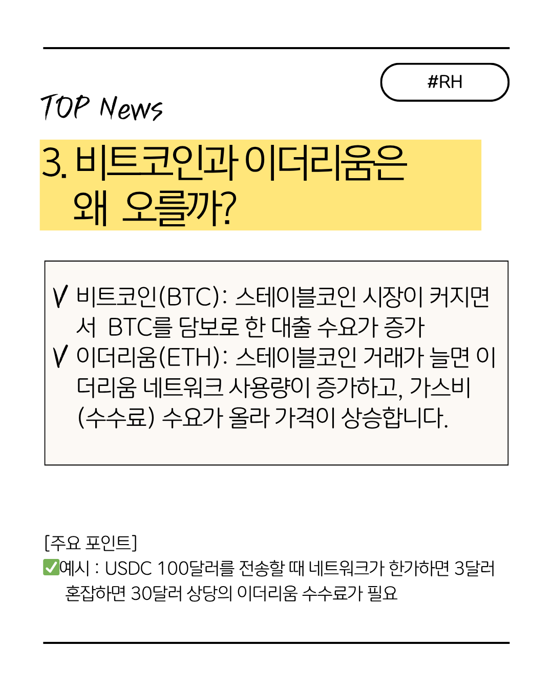 이더리움(ETH): 대부분 스테이블코인(USDC, USDT)은 이더리움 블록체인의 ERC-20 표준으로 운영됩니다. 스테이블코인 거래가 늘면 이더리움 네트워크 사용량이 증가하고, 가스비(수수료) 수요가 올라 가격이 상승합니다.