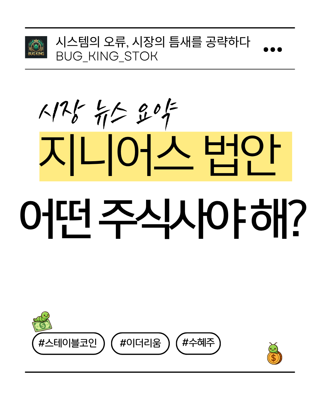 그럼 이제와서 스테이블 코인이 핫한데 과연 어떻게 풀어나가려고 하는걸까요? 그 답은 스테이블코인의 규제와 담보 구조에 있었습니다. 이제 미국은 지니어스 법안을 통해 이 스테이블코인을 제도권 금융의 핵심으로 만들려 하고 있습니다. 이 법안은 단순히 암호화폐의 규제를 넘어, 미국 달러의 글로벌 패권을 디지털 세계로 확장하려는 야심 찬 계획입니다.